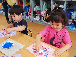 クラス活動では保育者とともに絵画や製作、リズム(音楽)活動、表現活動、サークルゲームなどを行います。