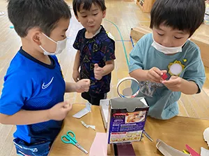 園舎内の壁は開放されており、お気に入りの場所で好きな遊びを楽しめます。廃材工作も人気です。