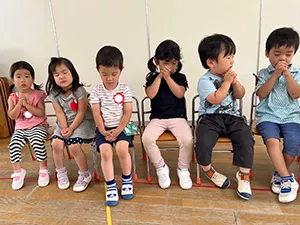 お片付けが終わったらクラス毎に集まって、毎日礼拝をいたします。お休みしているお友達のことや自分のこと、家族のことをお祈りします。